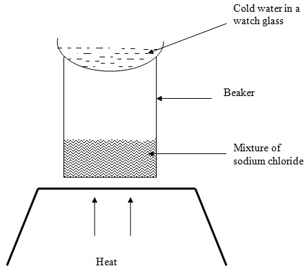 (c) When the mixture is heated, iodine sublimes into purple vapour. On reaching the surface of the watch glass, it is cooled and condensed into shiny black crystals of iodine.