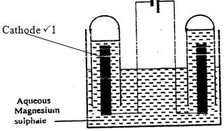 The set-up below was used during the electrolysis of aqueous magnesium sulphate using inert electrodes.