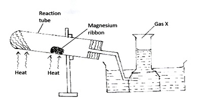 The set-up below was used to prepare and collect gas X. During the experiment cleaned magnesium ribbon was strongly heated before heating the wet glass wool.