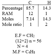 A compound Z has a molar mass of 56g and contains 853% carbon and 14.3% hydrogen by mass.