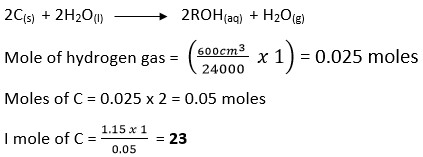- When 1.15g of C were reacted with water, 600cm3 of gas was produced. Determine the reactive atomic mass of C. (Molar gas volume = 24 000cm3)
