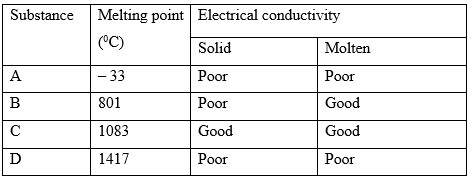 The table below shows properties of four substances. Study it and use it to answer the questions that follow.