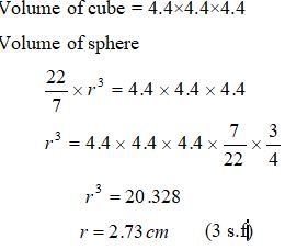 Metal cube of side 4.4cm was melted and the molten material used to make a sphere. Find to 3 significant figures the radius of the sphere
