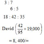 Peter, James and David contributed sh.19, 000. The ratio of contribution of Peter to David was 3:7 and that of David to James was 6:5. How much did David contribute