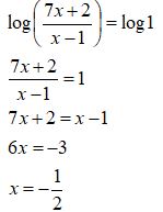 Solve for x in log (7x + 2) – log (x – 1) = 0.
